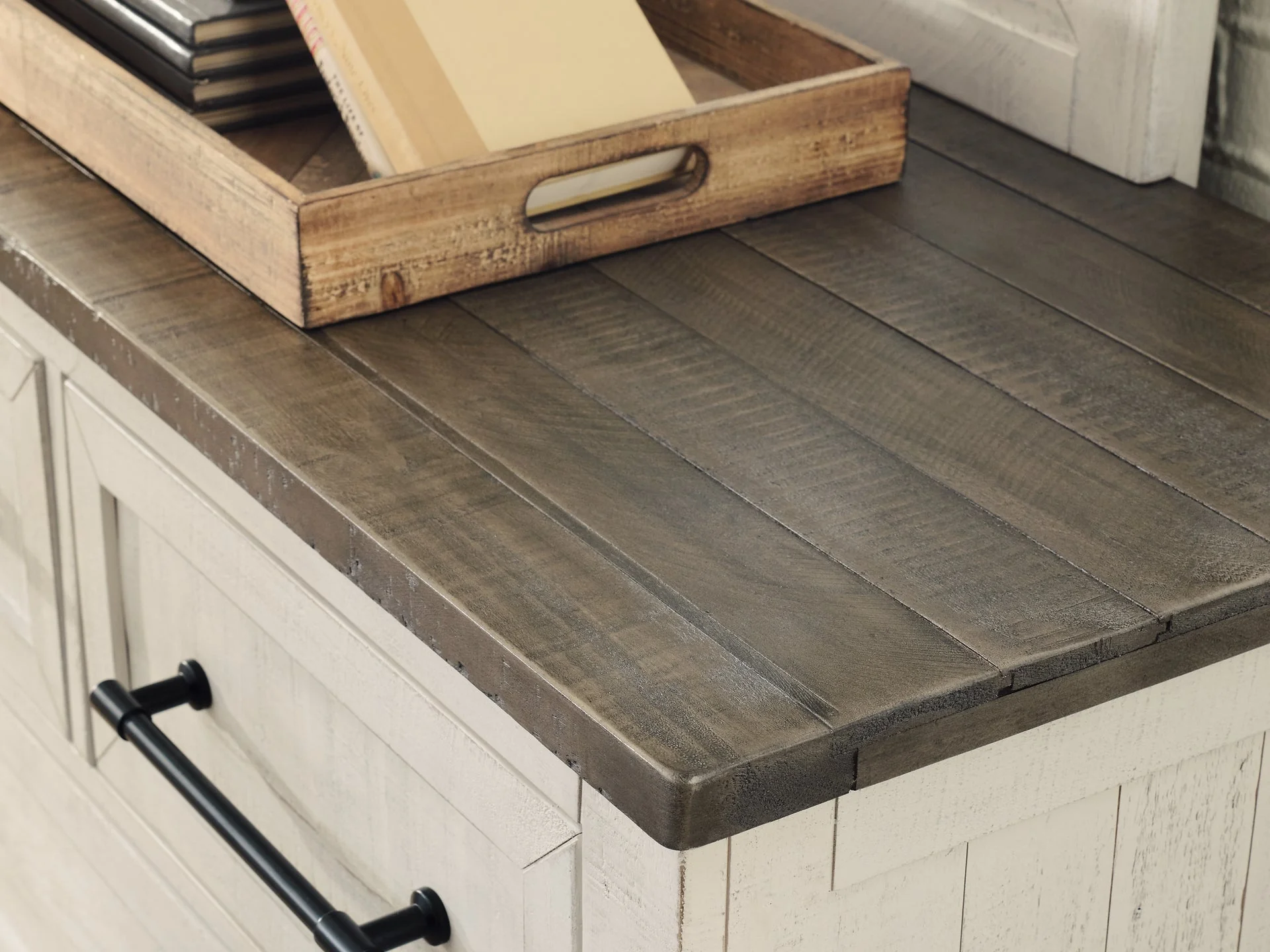 | Details | Includes dresser and mirror, Made with pine wood, pine veneer and engineered wood, Distressed two-tone finish in weathered gray and vintage white, Metal bar pulls with aged iron-tone finish, 7 smooth-gliding drawers with dovetail construction, Mirror attaches to back of dresser, Assembly required | |