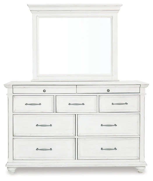 Give your retreat vintage charm and valuable drawer storage with this dresser and mirror set. In a beautifully distressed whitewash finish, you'll love putting it all away in casual style. Seven full-sized drawers and two accessory top drawers will easily accommodate your needs. Its beveled mirror brings magnificent height to this piece. Generously scaled moulding from top to bottom, along with bun feet and drawer handles with a transitional aesthetic, give this dresser and mirror character—evoking the feel of a quaint cottage escape.