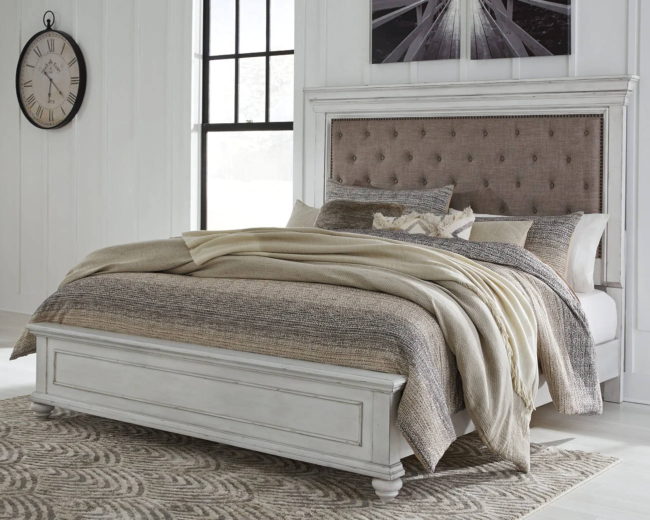 | Details | Includes queen upholstered headboard, panel footboard and rails, Made with solid wood, veneers and engineered wood, Distressed whitewash finish, Button tufted fabric upholstery, Nailhead trim, Assembly required | |